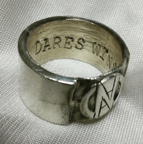 .925 oxidized silver men’s ring with Conflict logo engraved. hand stamped “who dares wins” on inner band. commissioned by professor falcon, tattooer